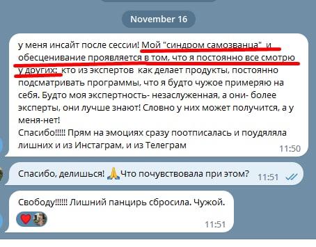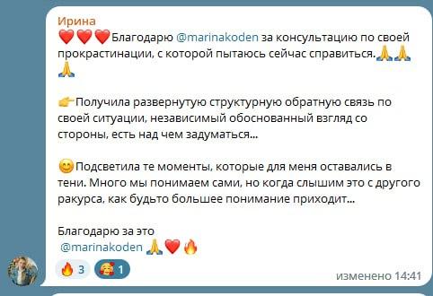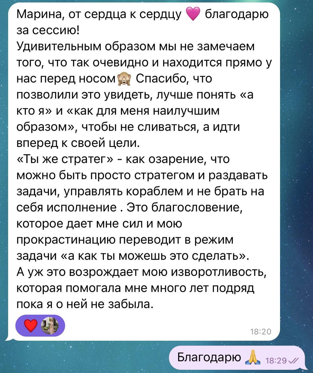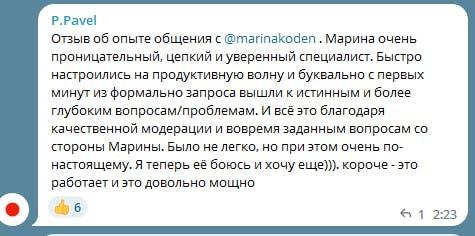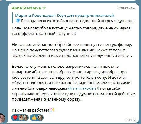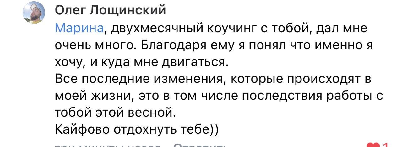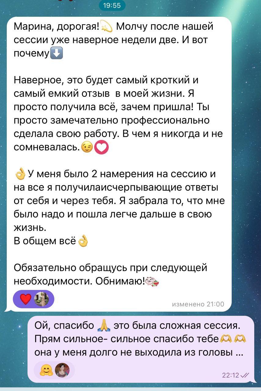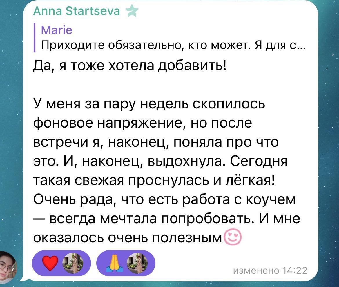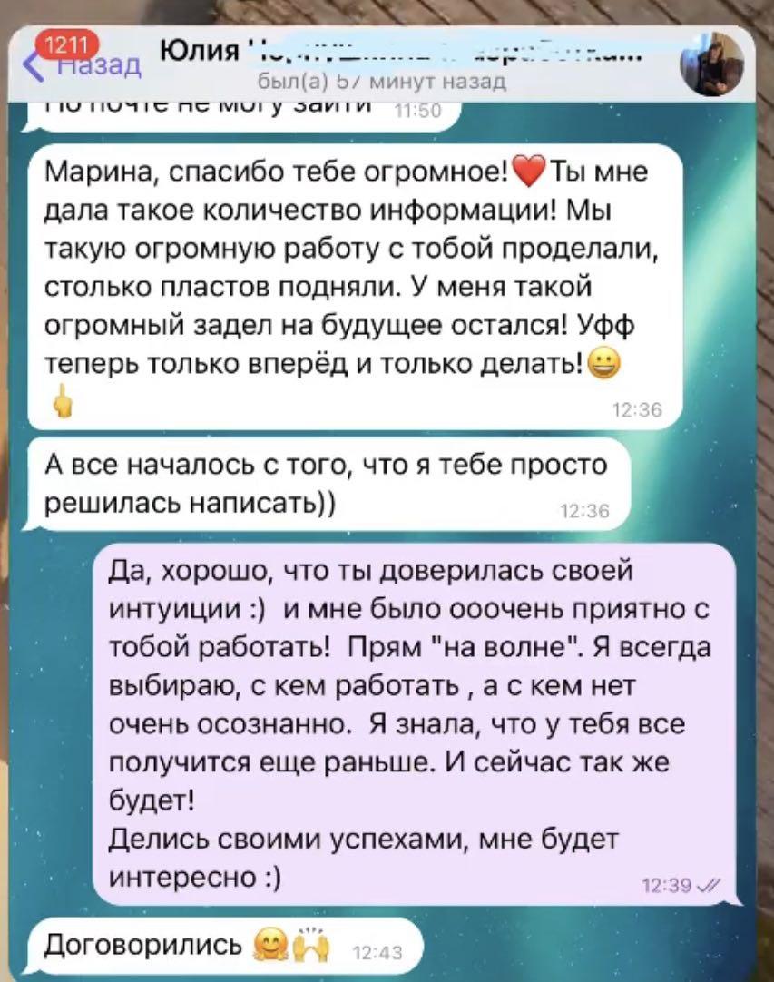 В конце коучинговой беседы вы чувствуете легкость и прилив энергии от новых удивительных инсайтов о себе и о том, как возможно распаковать ваш природный потенциал, а жизнь сделать более гармоничной и устойчивой.